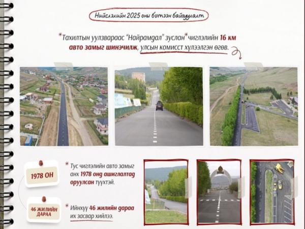 Харин энэ онд үлдсэн 12 км авто замыг шинэчилж, гэрэлтүүлэг, явган замын ажлыг дуусган улсын комисст хүлээлгэн өгөөд байна.