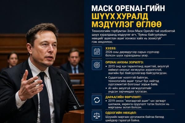 АНУ-д өрнөж буй OpenAI-тай холбоотой шүүхийн маргаанд технологийн тэрбумтан Элон Маск оролцож, буяны чиглэлтэй байгууллагын нөөцийг ашиглан ашиг олох нь зохисгүй хэмээн мэдүүлэг өгсөн талаар олон улсын хэвлэлүүд мэдээллээ.