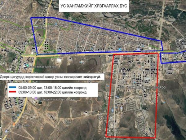 Энэ хүрээнд ХУД-ийн 5, 6, 7, 23, 24 дүгээр хорооны хэрэглээний усыг өнөөдөр 22:00 цагаас 11 дүгээр сарын 8-ны 08:00 цаг хүртэл хэсэгчлэн хязгаарлана.