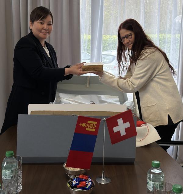 Швейцарын Холбооны Улсын Бернийн их сургуулийн номын санд хадгалагдаж байсан Монголын түүх, соёлын үнэт өвд хамаарах хоёр ховор бичвэрийг Монгол Улсад буцаан шилжүүлэх ёслол Монгол Улсаас Швейцарын Холбооны Улсад суугаа Элчин сайдын яаманд боллоо.